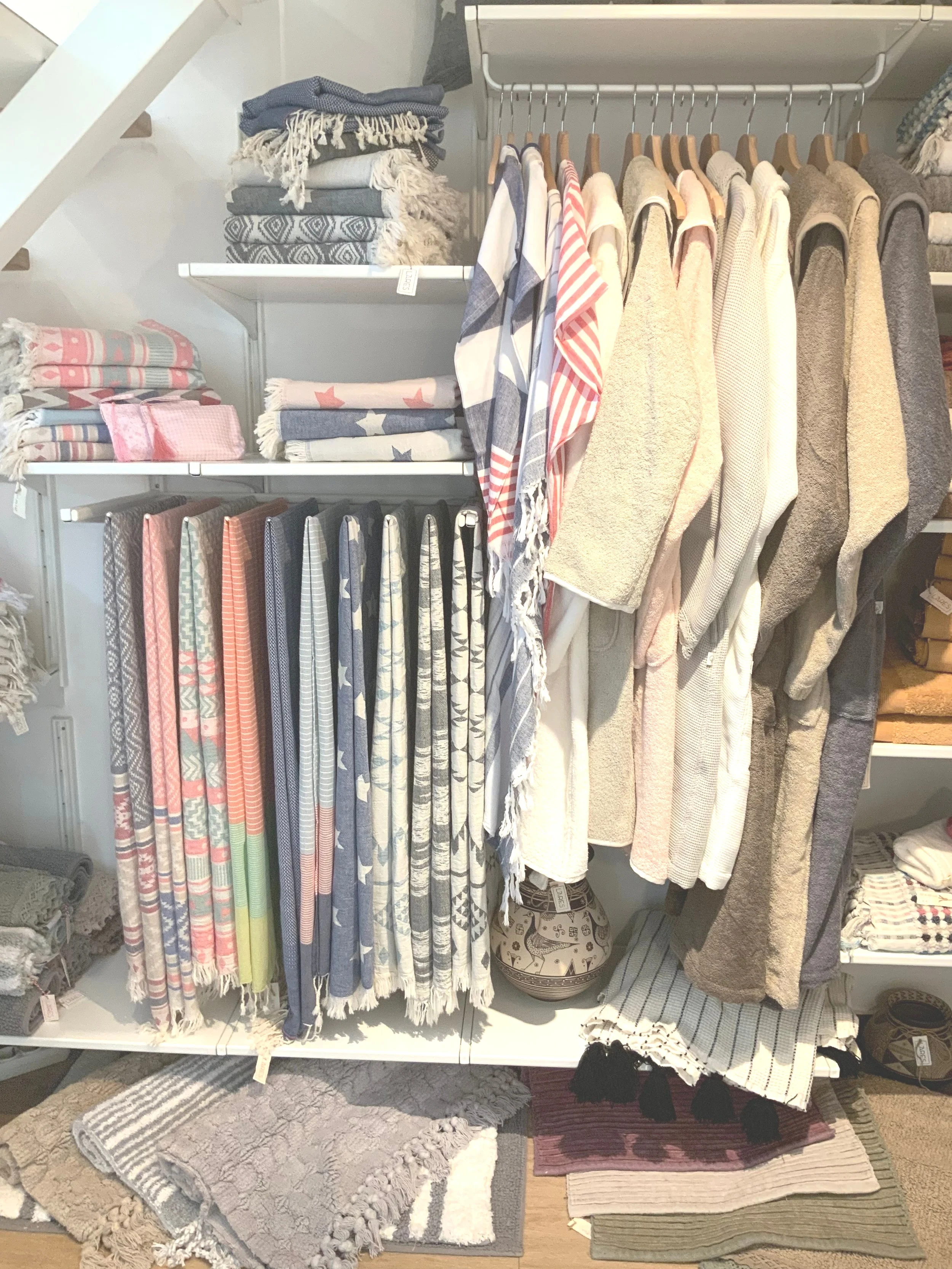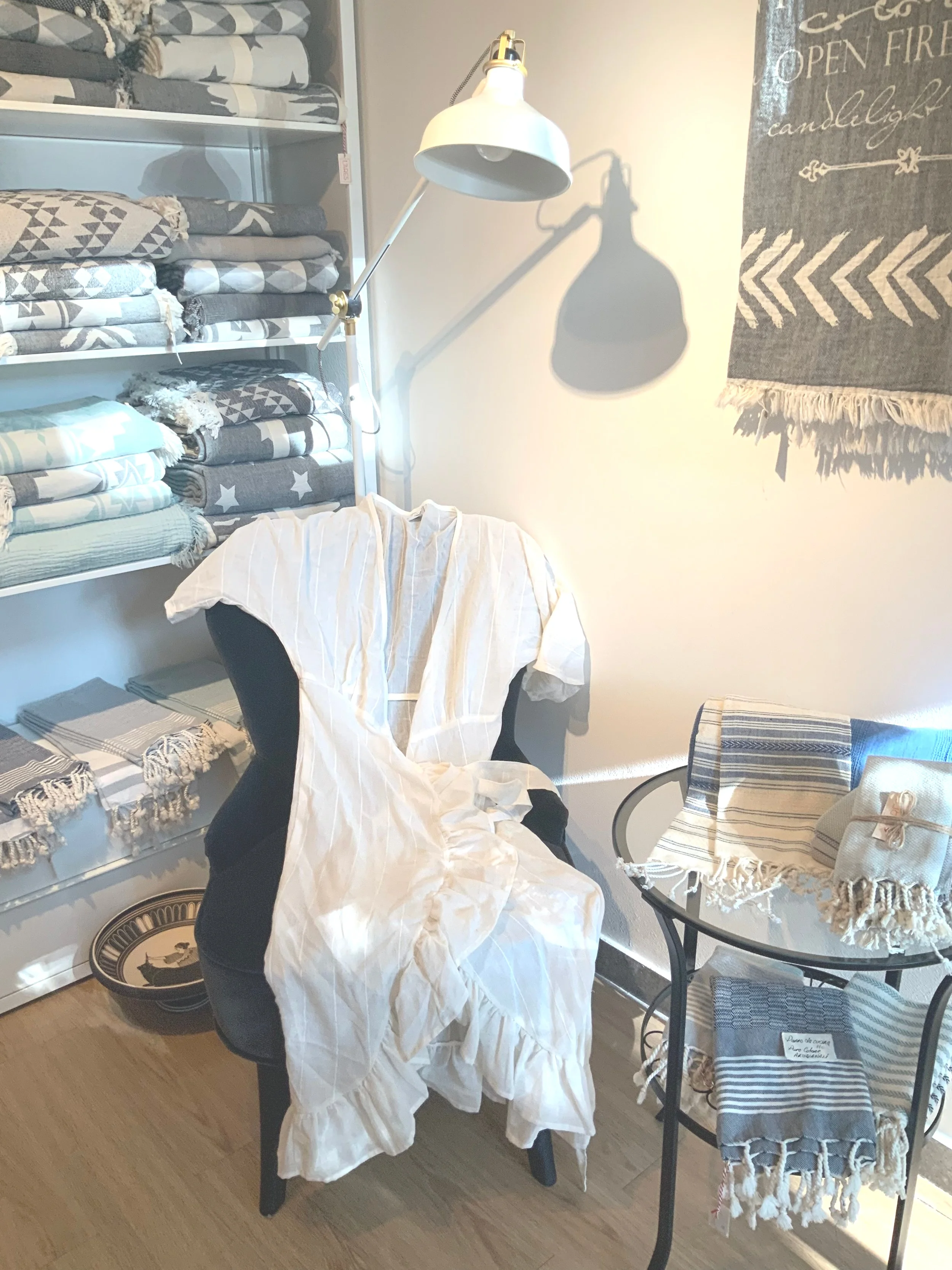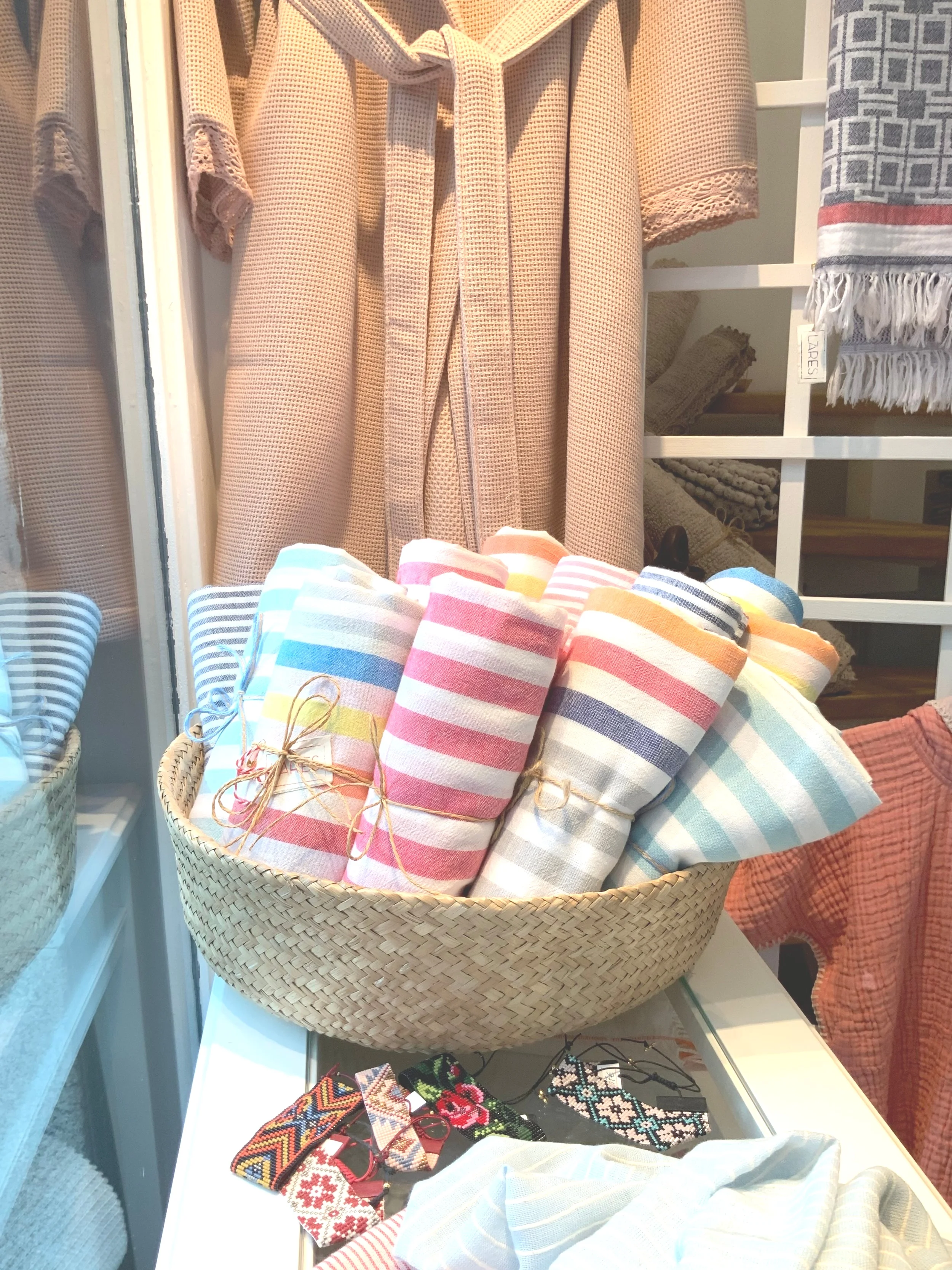 Nella piccola boutique si possono trovare tessili per la casa e per il bagno: teli mare, coperte, cuscini, spugne e accessori, creazioni speciali fatti a mano e molto altro.